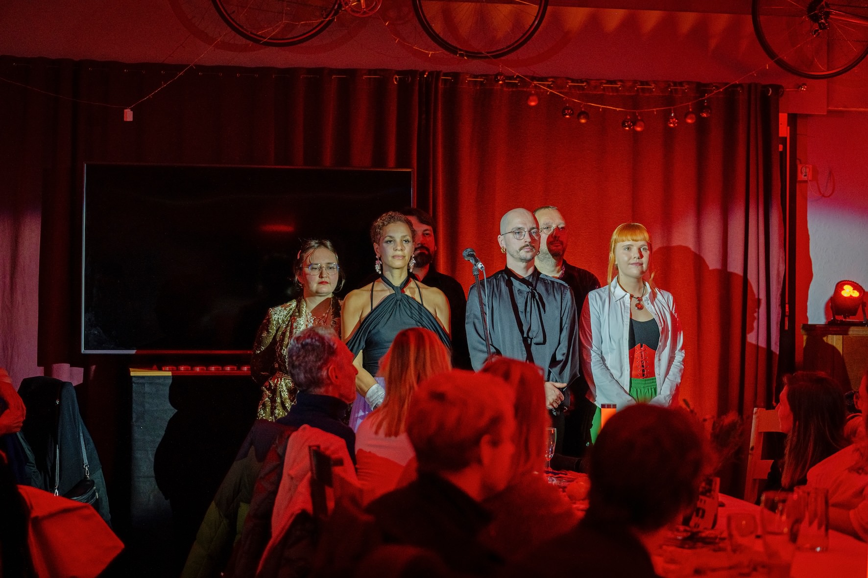 Dickes Blut – eine Familienfeier mit dem Citizen.KANE.Kollektiv lädt die Zuschauer*innen ein Platz zu nehmen, Gast zu sein, Teil der Familie zu werden –- oder einfach nur staunend zu beobachten, wie sich die Grenzen zwischen Tisch und Bühne, zwischen Spiel und Leben auflösen. Für diesen Abend haben die sechs Kollektivmitglieder Carina, Christian, Ida, Malin, Maximilian und Nikita etwas gewagt, was man selten tut: Sie haben ihre Eltern getauscht. Sie haben mit den Müttern und Vätern der anderen gesprochen – über Herkunft und Entfremdung, über Schweigen, Ideologien, Zärtlichkeit und das Älterwerden.
